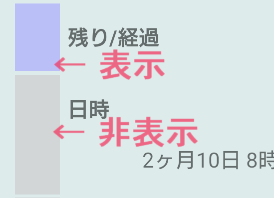 「指定日時タイプ」と「繰返しの日単位」は『経過』となり得ますが、その他のタイプは常に『残り』となります。 - 『日時、年月日、時分、総日数、週日付、総分』