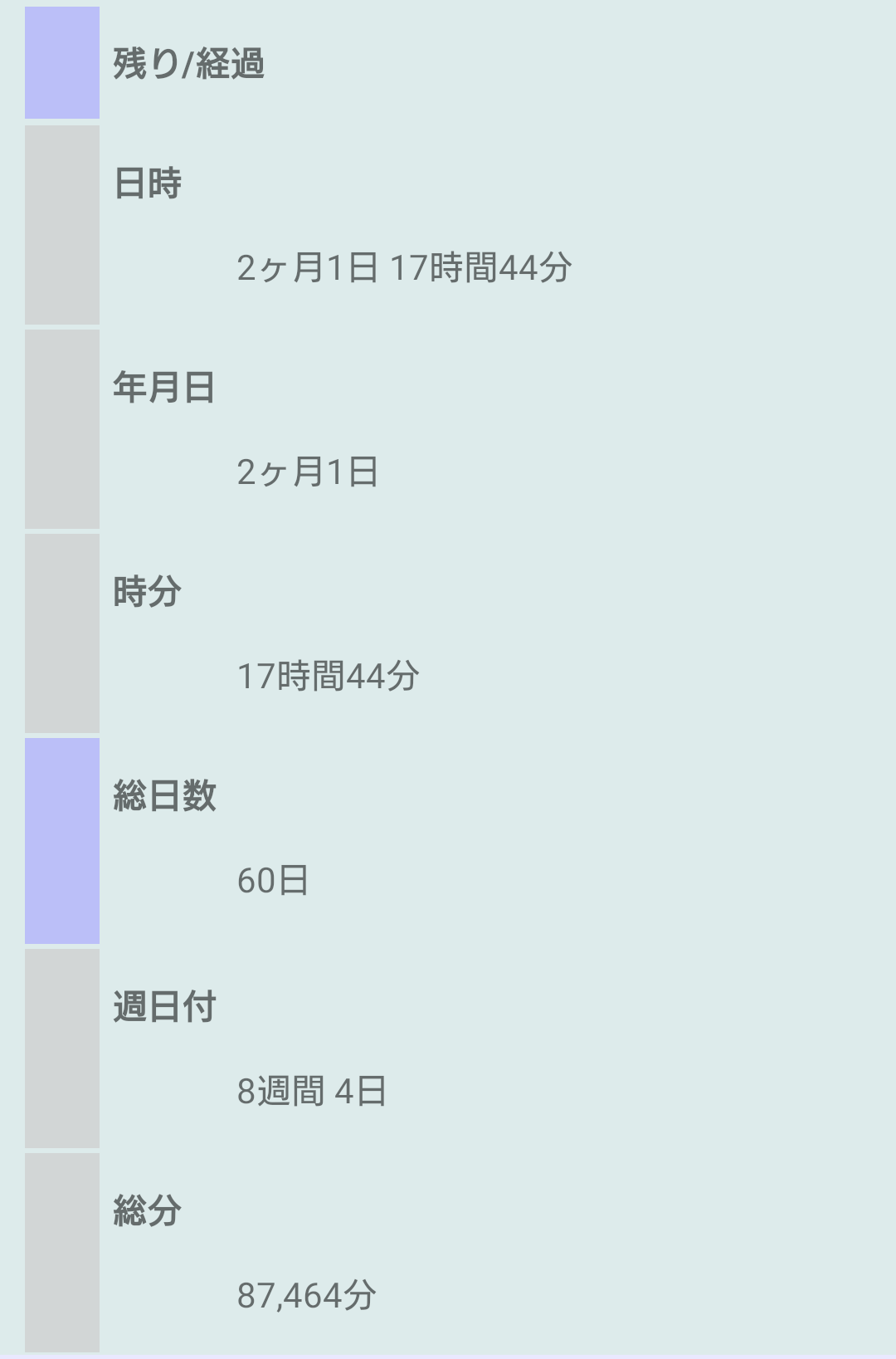 (例) 残り 243分、残り 2年7ヶ月14日、等。