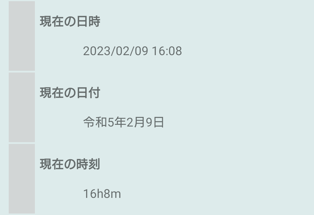 - 現在の日時です。単体のウィジット上で、時計の代わりとして表示したい場合に便利です。