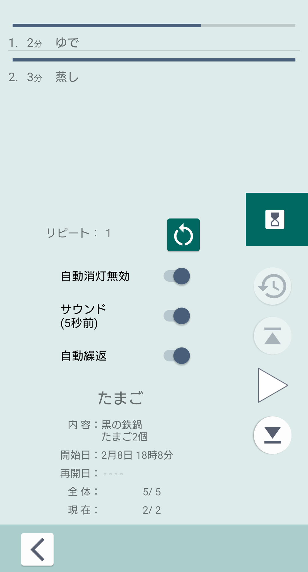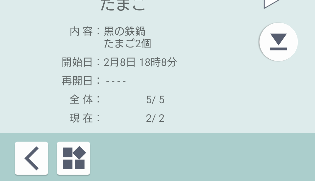 - 現在進行中であれば一時停止、一時停止であればカウントダウンを再開します。
